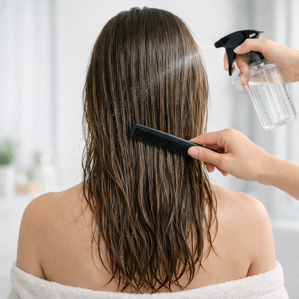 Haare leicht anfeuchten und gründlich durchkämmen. Die Haare sollten für die perfekte Anwendung nicht trocken sein.